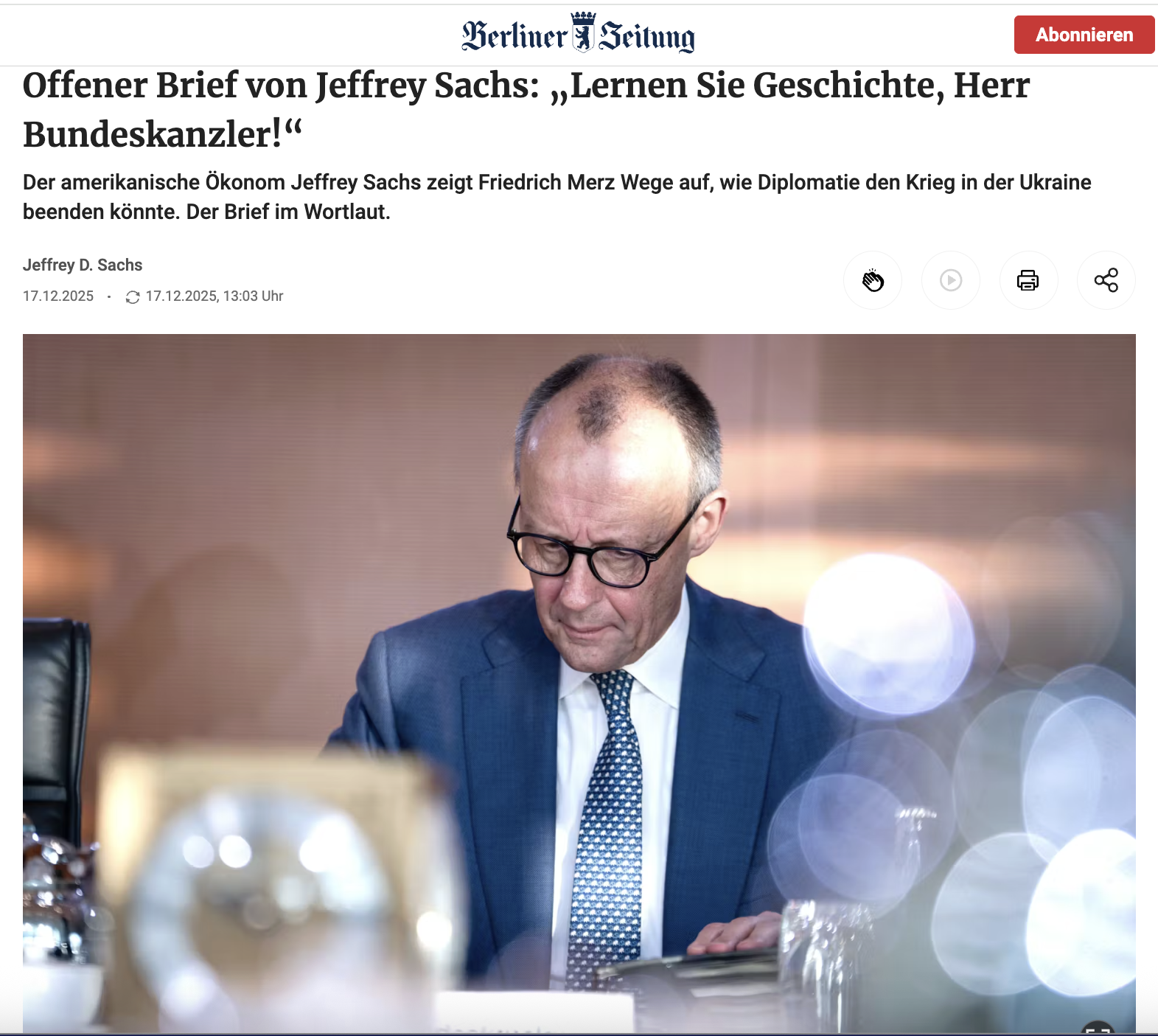 Jeffrey SACHS, professeur à la Columbia University, vient de nous communiquer le texte de la Lettre ouverte au Chancelier Friedrich MERZ. Elle vient d'être publiée dans le Berliner Zeitung de ce 17 décembre 2025 à propos du Cadre de sécurité européenne et de l’OSCE.